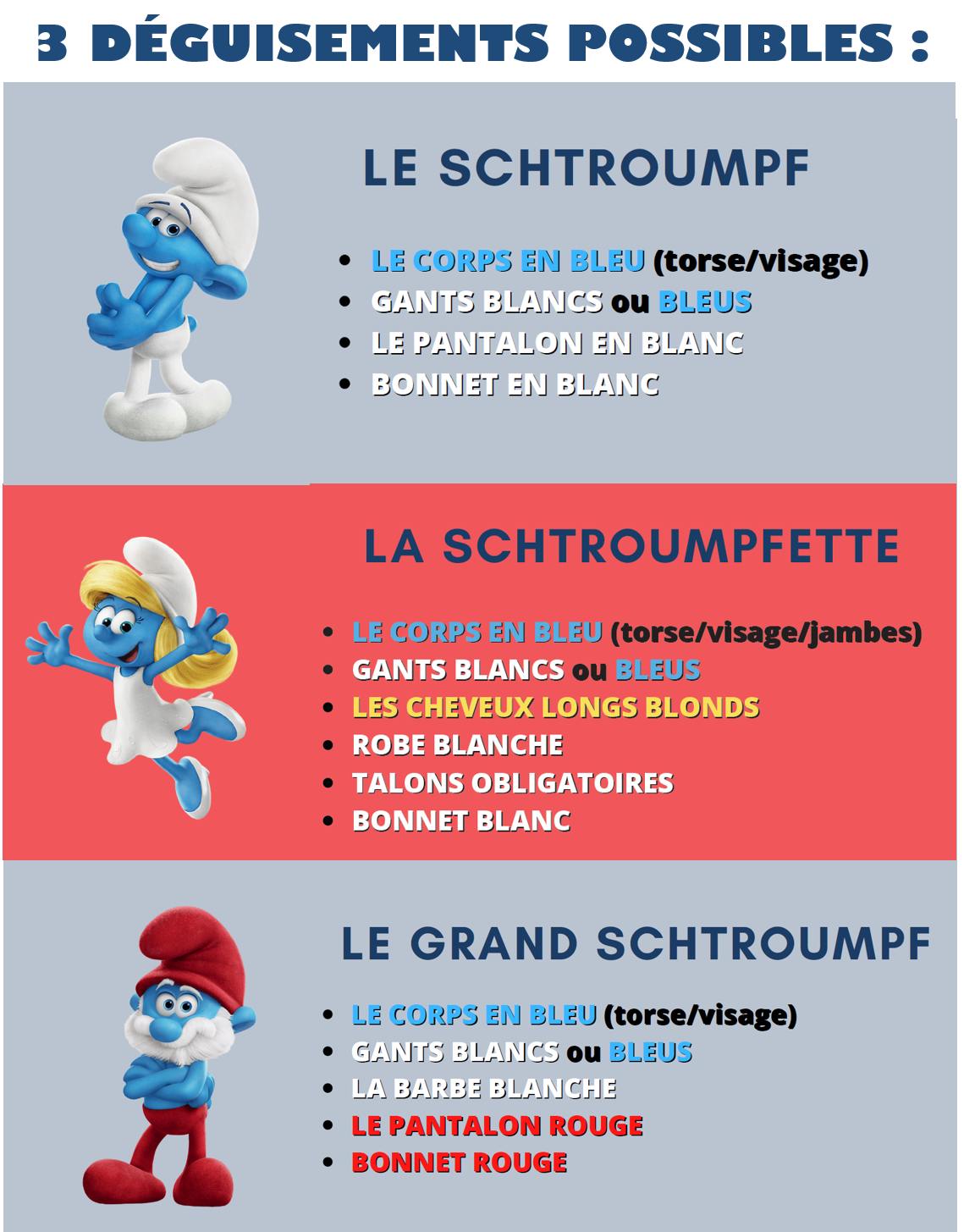 Pour participer au record du monde, il faut faire son choix entre 3 déguisements : le Schtroumpf, la Schtroumpfette et le Grand Schtroumpf. Pour être comptabilisé, il faut bien respecter les consignes ci-dessous :